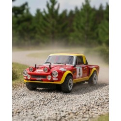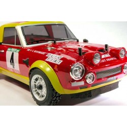 Amazing scale reproduction of the Fiat Abarth 124 rally , winner of the Portugal Vinho di Porto Rally in 1975 with Alen-Kivimaki. Same dimensions and characteristics of all the other models of the series, same 4WD chassis, but with an aluminium CNC black anodized upper deck, and waterproof electronics. 6 Kg. steering servo. RTR "ready to run" with 2.4 GHZradio, NiMh battery and quick peak AC smart charger. We took maximum care reproducing all details of the body, with wipers, rear side mirror, the exhaust and the additional front lights, injection molded in plastic. All the lights are ready to accept the LED light system (optional). The scale body is vacu-formed in PC and comes completely painted, assembled, decaled and trimmed.