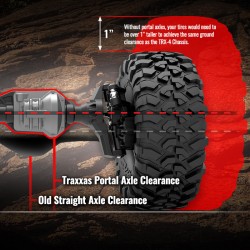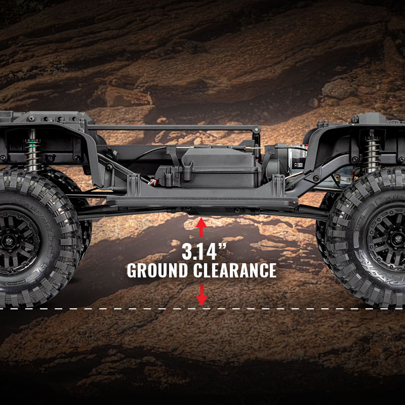 The TRX-4 Scale and Trail Crawler is equipped right out of the box with Traxxas' game-changing portal axle set. Portal axles lift the truck at the wheels for huge center pumpkin ground clearance. In order to achieve the same clearance with straight axles (and not get stuck), your tires would have to be over an inch taller than the TRX-4's tires. Straddling boulders with ease, the TRX-4 chassis definitely takes the path less travelled and simply leaves all the others behind.