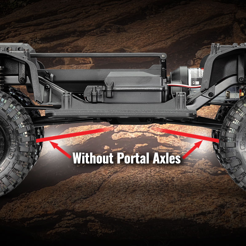 The portal axles use gear reduction right at the wheels that dramatically reduces undesirable torque twist. Total axle gear reduction is over twice non-portal designs. The Titan 550 motor torque is translated into straight, powerful, forward motion, rather than wasted energy twisting your rig right off the rocks.